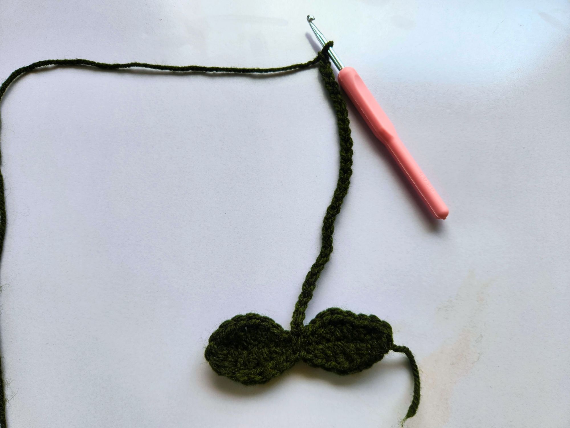 - Locate the side yarn tail and the starting chain stitch at the base of the leaf.